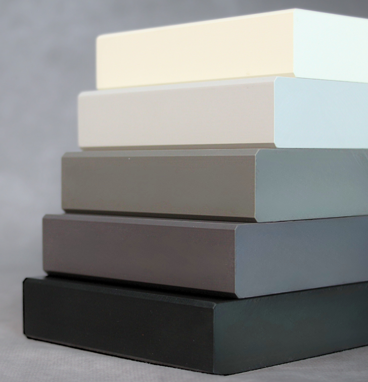 In addition to the industry standard and traditional black surface and core MaxRE material, Fundermax™ is introducing a new color range that includes white core; pastel grey core, charcoal grey core, and volcano grey core.